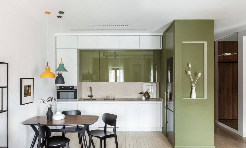 В некоторых примерах допускается разбавление серо-зелёного сочетания при помощи чёрного, белого или других оттенков, и в этом случае их количество должно быть минимальным. Прекрасным дополнением просторной и светлой кухни в серо-зелёных тонах станет напольный горшок с цветами, который можно поставить в один из углов или возле окна.