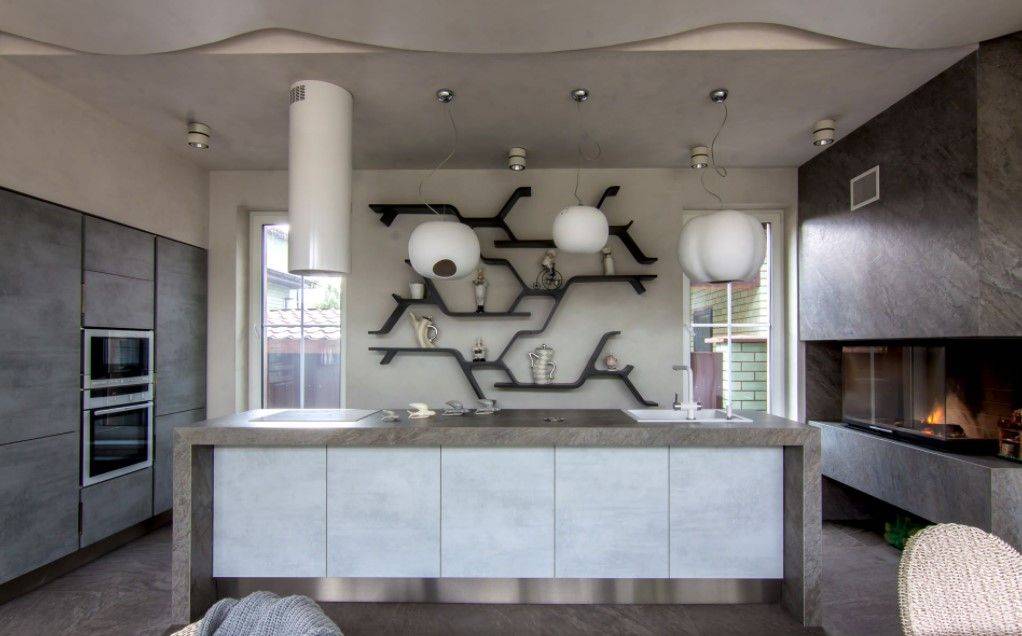 Оформляя кухню в серых тонах, потолок лучше все-таки оставить белым.