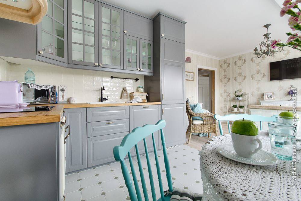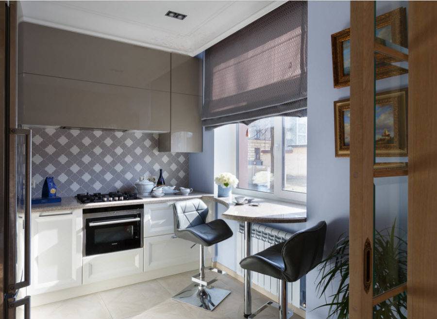 Если же кухонька малогабаритная, то ее можно оформлять исключительно в самых светлых дымчатых оттенках, и лишь немного оттенить более темными.