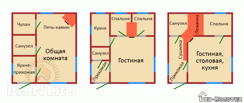 Третья схема с печью для отопления и приготовления пищи — бюджетный вариант жилья для холостяка либо небольшой семьи. Плюсы — теплая лежанка и возможность размещения в прихожей сушилки.