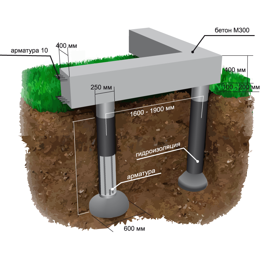 Ширину ростверка выбирают по толщине несущих стен, но не меньше диаметра свай, нависание над которыми допускается до 10 см. Высоту ростверка выбирают в пределах 30–60 см, учитывая климатические условия в регионе.