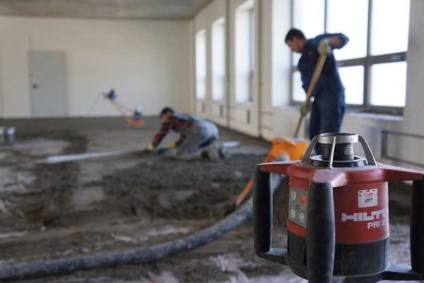 - Для того, чтобы наиболее точно выставить уровень высоты стяжки, требуется применить лазерный уровень.