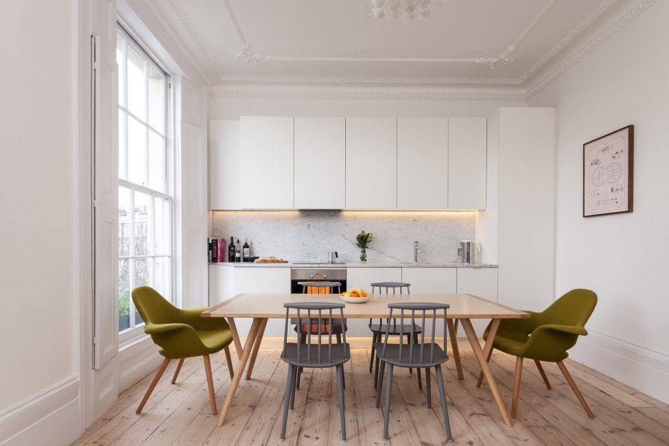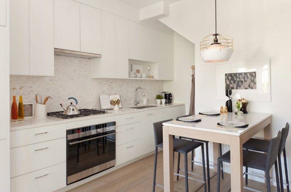 На маленькой кухне будет уместным стол-книжка или компактный стол для завтраков в скандинавском стиле и пара ярких стульев. Часто стол заменяет небольшая барная стойка вдоль стены.