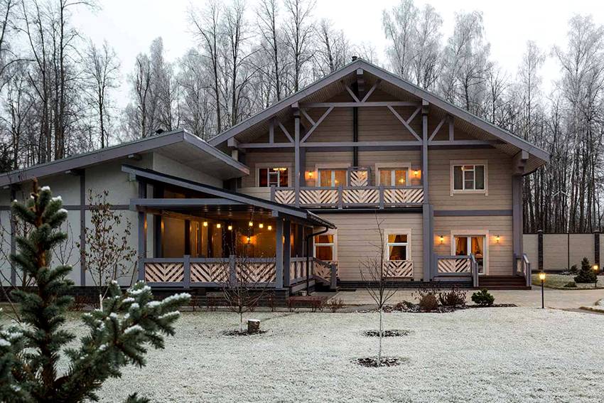 Древесину оставляют без особых изменений, то есть не покрывают краской или лаком. Но при необходимости, чтобы придать фасаду свежий внешний вид, дерево все же могут покрыть лаком или затонировать.