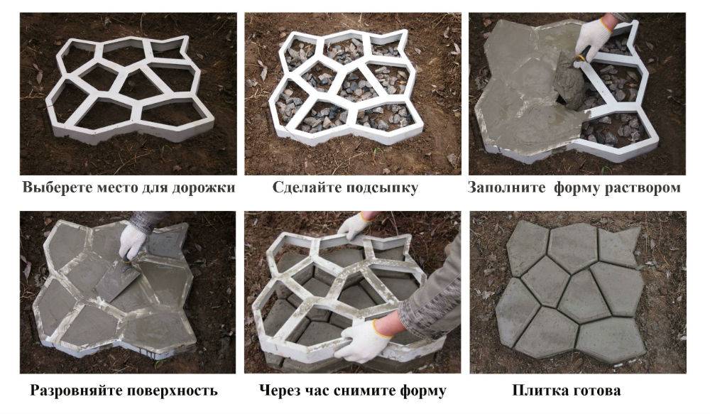 Технология заливки в форму-опалубку — самый простой и наименее трудоёмкий способ изготовления тротуарной плитки. Изделия отливаются прямо на месте использования поверх утрамбованного грунта, поэтому никаких усилий на сушку и перемещение плит тратить не приходится. Поскольку форма снимается пока бетон застыл не полностью, можно пользоваться только одной формой и готовить небольшие порции раствора в ведре строительным миксером (без бетономешалки). Форму также можно заливать не полностью, формируя аккуратные изгибы садовой дорожки.