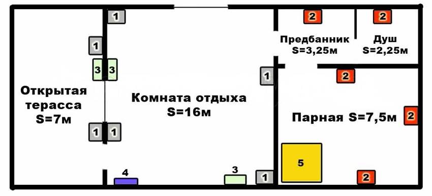Пример электросхемы бани: 1 — светодиодные светильники, 2 — специальные термо- и влагозащитные светильники, 3 — розетки, 4 — электрощит, 5 — печь