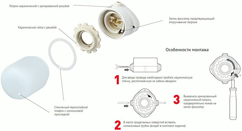 Схема монтажа термостойкого стеклянного светильника с керамическим патроном для сауны