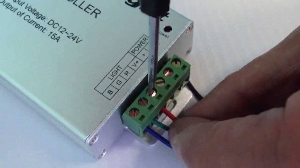 RGB контроллеры применяются для управления работой цветных светодиодных лент. Подключение этих устройств также не вызывает особенной сложности. Ко входу контроллера подсоединяются красный и черный провода, выходящие из адаптера