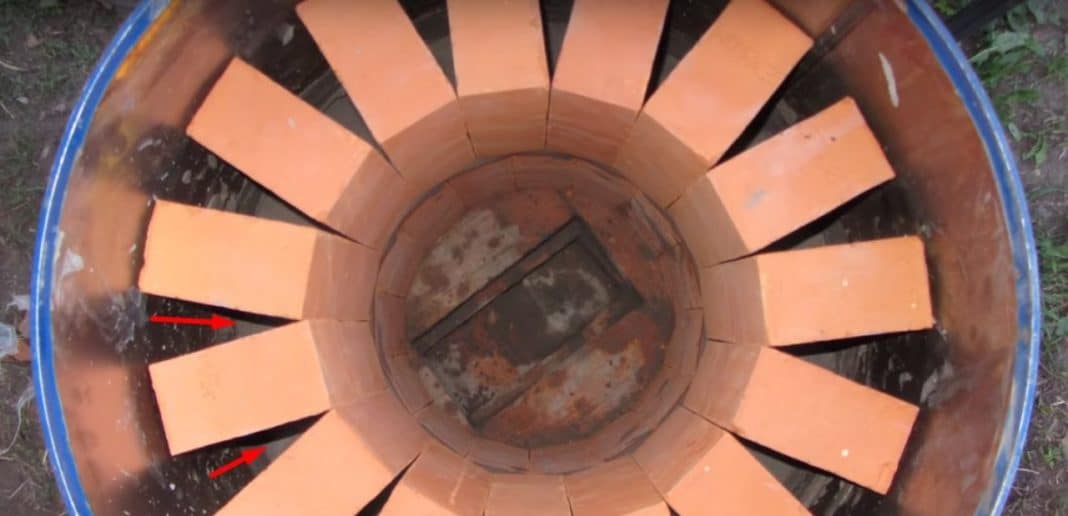 Циркулярной пилой вырезается дно бочки. Сбоку проделывается небольшое отверстие для поддува. Изнутри бочка обкладывается подготовленными кирпичами (можно использовать и заводской красный кирпич) и скрепляются они каолиновой глиной.