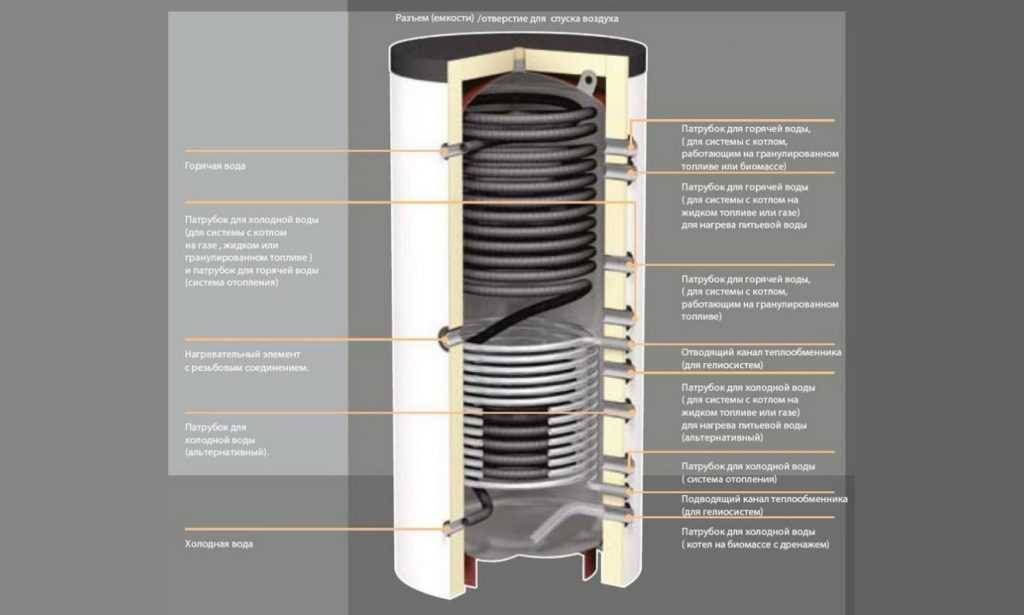 Принцип работы устройства определяет и саму конструкцию. Обычно заводские приборы представляют собой цельную просторную металлическую емкость, внутри которой расположены дополнительные теплообменники. Как правило, такие изделия имеют спиральную, змеевидную форму, повторяя цилиндрическую конфигурацию основного устройства.