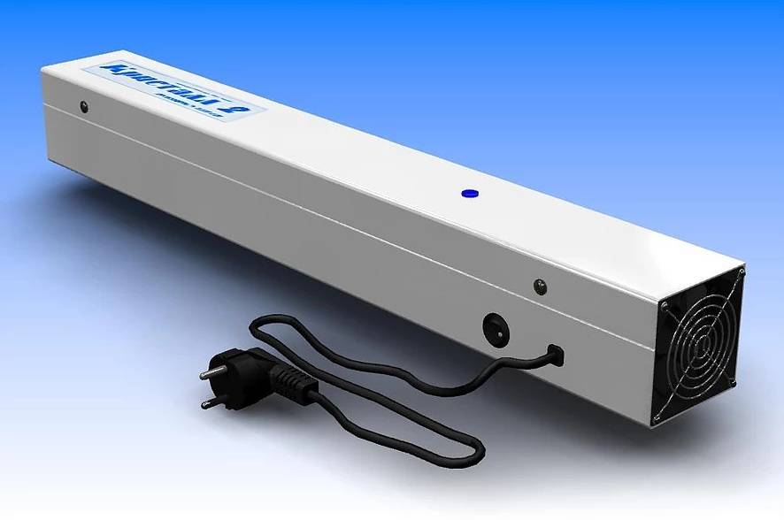 Это облучатель закрытого типа, оснащается двумя бактерицидными лампами по 11 Вт, может быть закреплен на стене. Производительность – 60 м3/час. Ресурс работы лампы – 6 000 часов. Потом лампу типа PL-S Phillips надо будет заменить – расходники есть в свободной продаже. Отличное устройство за свои деньги, стоит 14 000 рублей.