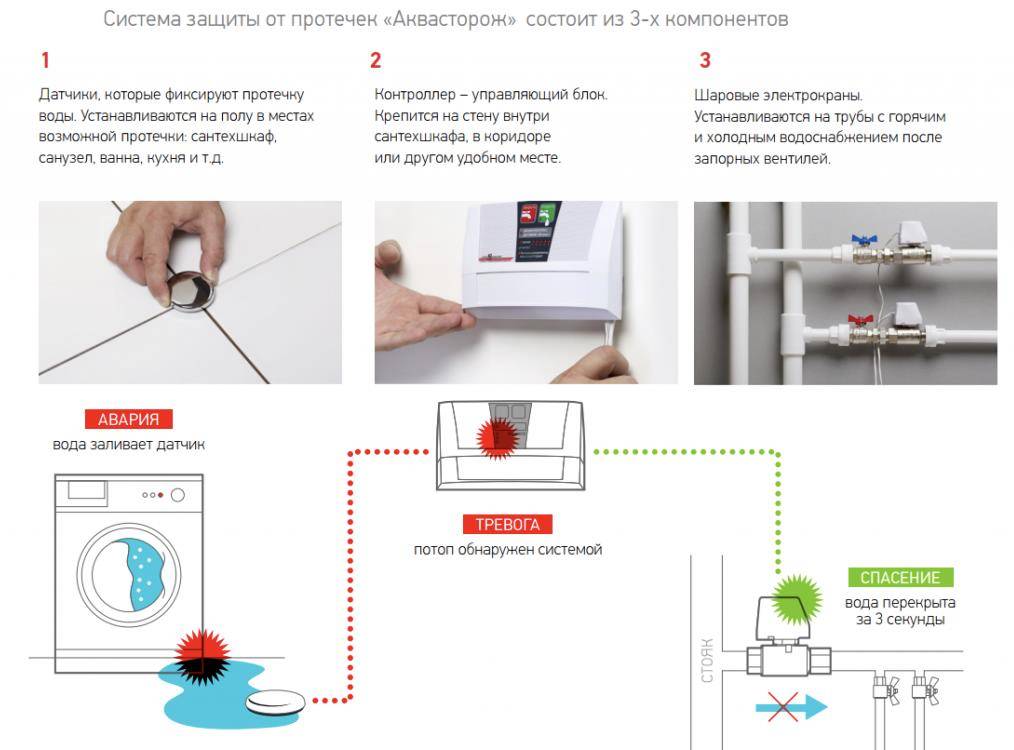В систему встраивается специализированный датчик, который и гарантирует предохранение от протечки воды. На современных этапах ассортиментный ряд все время увеличивается, и производители предоставляют усовершенствованную модель системы. Необходимо добавить, что у некоторых систем есть элементарный сигнализатор и можно увидеть инновационные решения – они автоматически могут перекрыть воду в комнату, если установили протечку. То есть устройство быстро среагирует на ситуацию и сделает так, чтобы предохранить как пользователей, так и их соседей. Монтаж системы производится как самими покупателями, так и приглашенными специалистами. К любому прибору прилагается особая инструкция по применению.