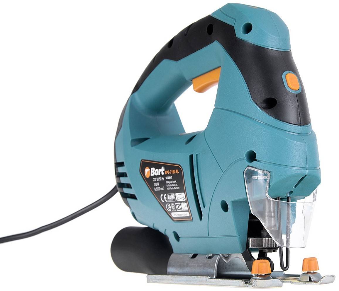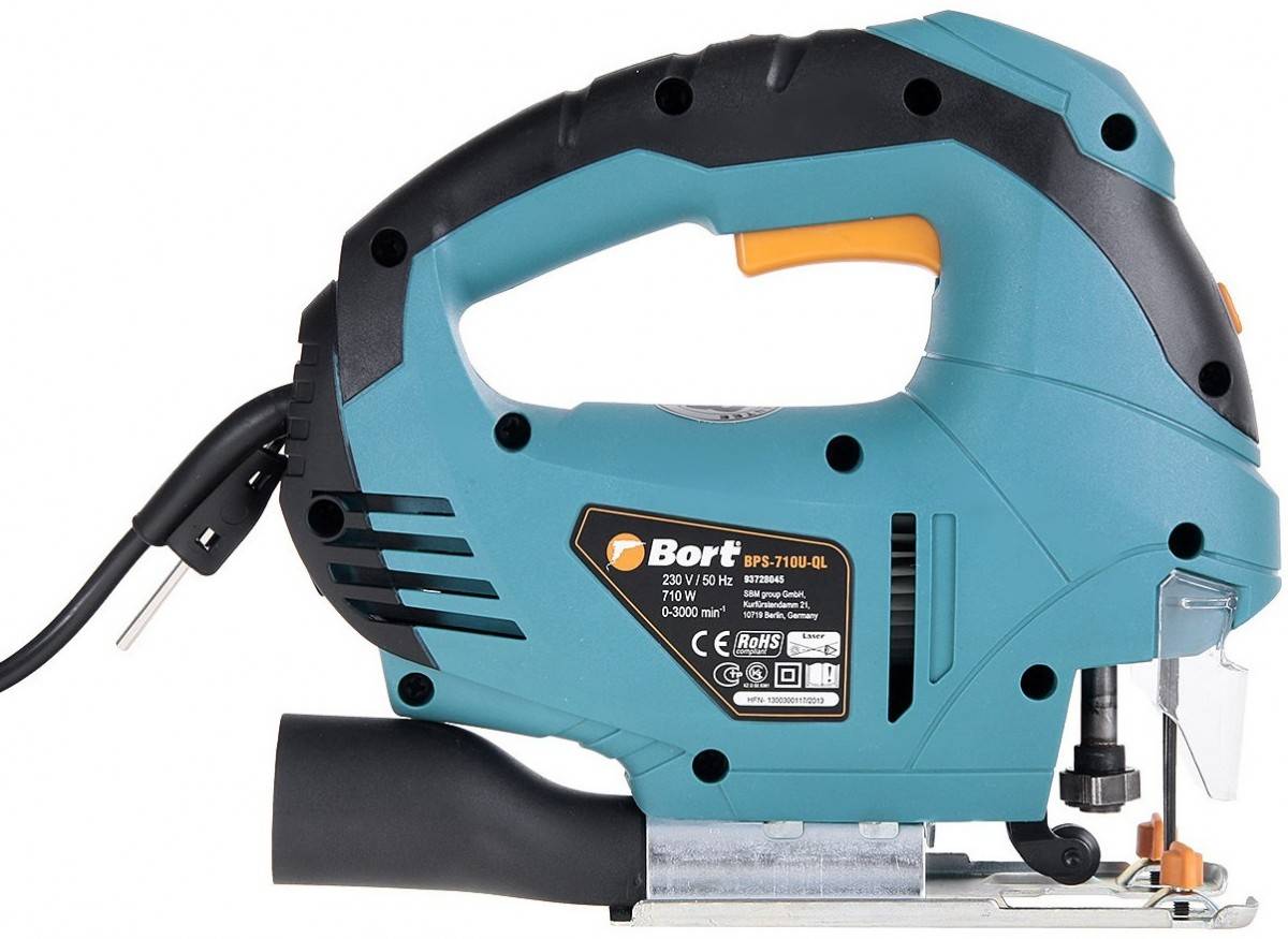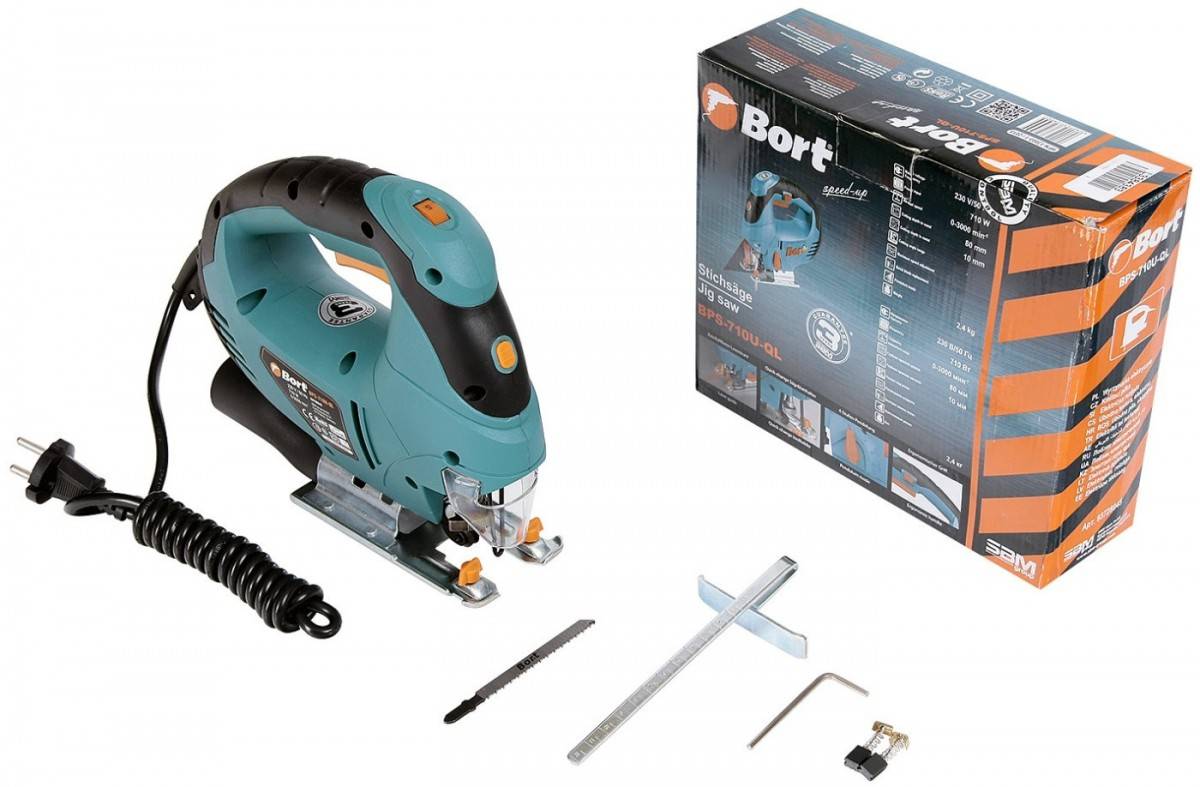 На второй позиции лучших недорогих электрических лобзиков разместился бытовой электролобзик Bort BPS-710U-QL имеющий хороший запас мощности в 710 Вт и немаленький вес в 2.4 кг. Модель имеет регулируемую частоту хода, лазерный указатель, быстрозажимной механизм крепления пилки и 4-х ступенчатый маятниковый ход. Мощность электродвигателя достаточная для пропила древесины глубиной 80 мм и стали до 10 мм. Удобное управление и корпус без скрипов делают этот хороший лобзик идеальным вариантом стающим своих денег.