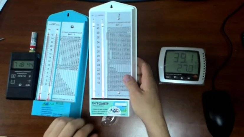 Сухой термометр определяет температуру внутреннего воздуха в помещении, а мокрый — мокрого термометра. Психометрическим гигрометром как пользоваться, подробно описано в инструкции, которая прилагается в комплекте прибора. На панели размещены психрометрические таблицы для определения влажности воздуха. Снятие проводится сотрудником без задержек, так как долгое нахождение около прибора может изменить показатели и исказить результат измерения влажности. Для максимально точного результата прибор должен быть установлен так, чтобы глаза оператора располагались на уровне мениска термометров.