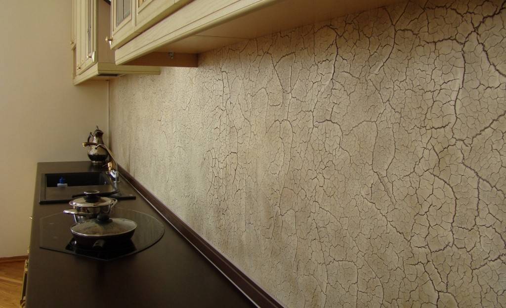 Текстурную краску можно использовать для оформления акцентной стены в кухне или кухне-столовой. Можно оформить только одну стену, которая находится далеко от рабочей зоны кухни. Нежелательно использовать ее для отделки фартука, так как отмывать рельефное покрытие сложнее. Исключение – если закрыть ее в последующем декоративным стеклом. Например, так можно оформить фартук под бетон и, чтобы было удобно мыть, заказать скинали из прозрачного закалённого стекла.