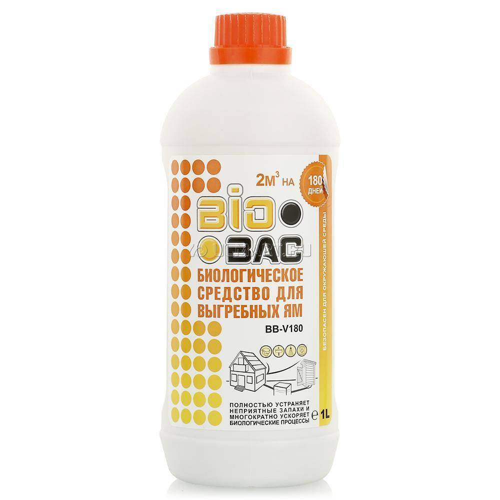 Средство для дачных туалетов и выгребных ям «BioBac BB-V 180» ориентировано на переработку 12м³ биологических отходов. Одной упаковки объемом 1 л хватает на 30-40 дней.