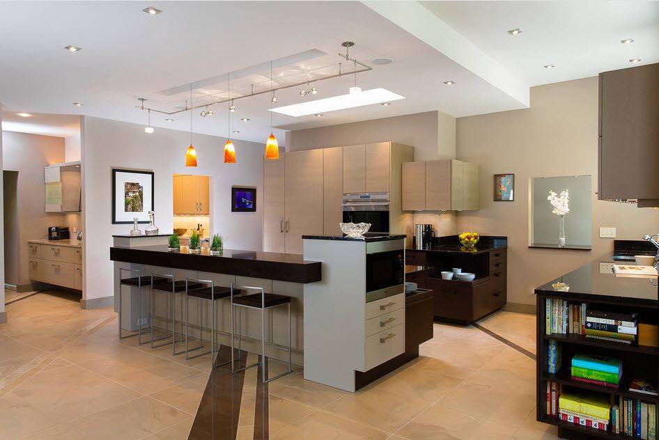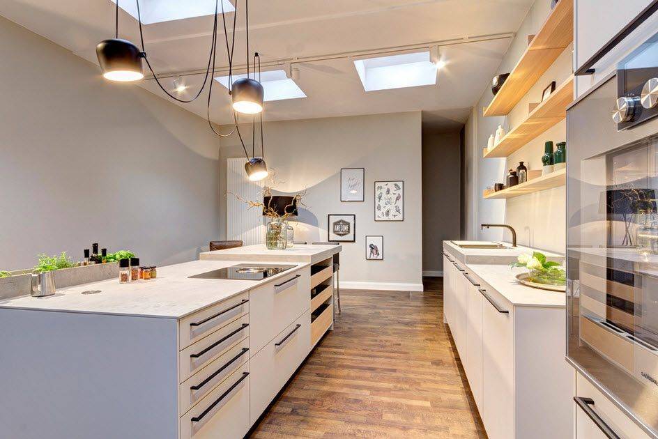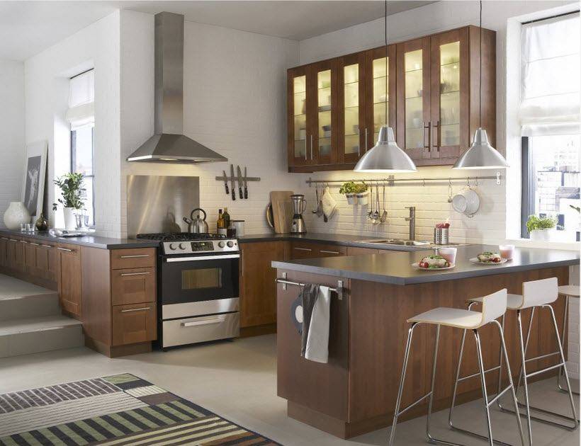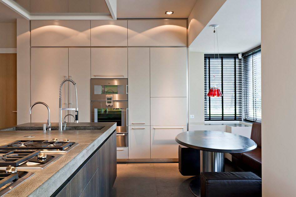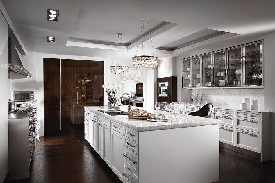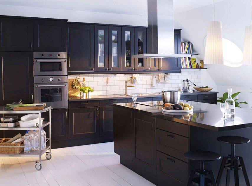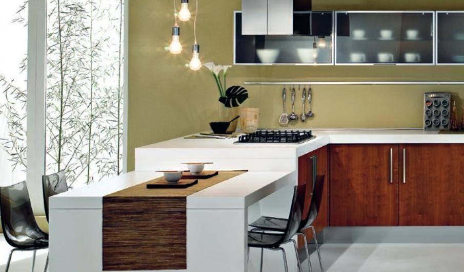 В островной или полуостровной планировке рабочая зона вместе с плитой и мойкой переносится в центр кухни. Кухни с островом выглядят круто, но во-первых подходят только для больших квартир, во-вторых подвести канализацию и воду для мойки на острове непросто. Зато это и выглядит очень дорого.