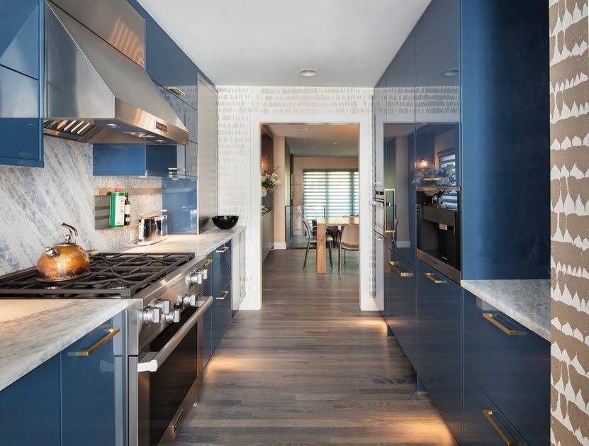 Если рассматривать стильные глянцевые кухни с точки зрения новых тенденций, то они имеют ряд преимуществ перед матовыми. Например, глянцевая поверхность может заставить кухню казаться больше, что станет весомым преимуществом в небольших помещениях. Кроме того, идеально гладкая и ровная текстура означает, что покрытие не впитывает жир, грязь, пыль или влагу. Это облегчает уборку кухни, так как все, что вам нужно сделать, это регулярно протирать поверхность влажной тряпкой.