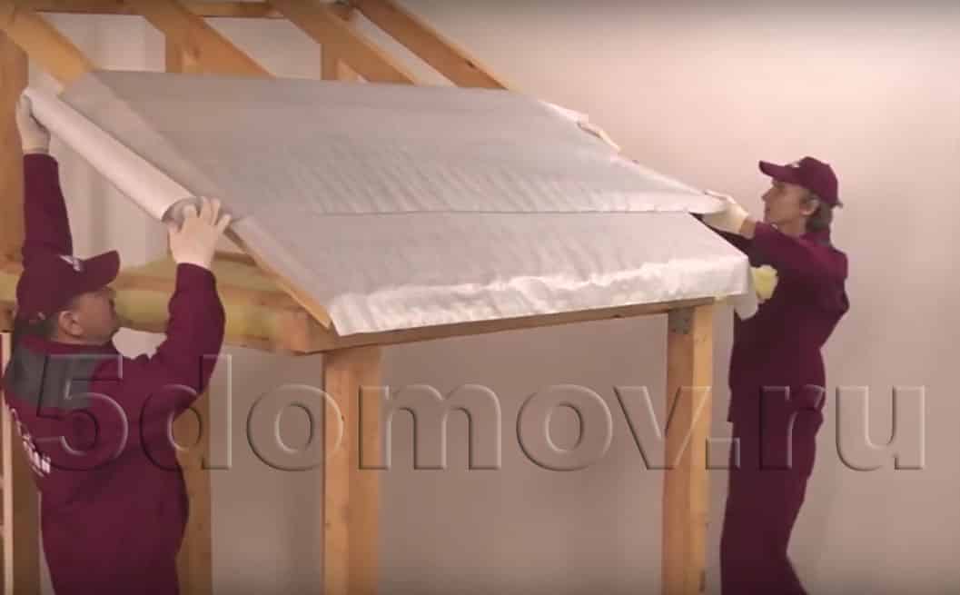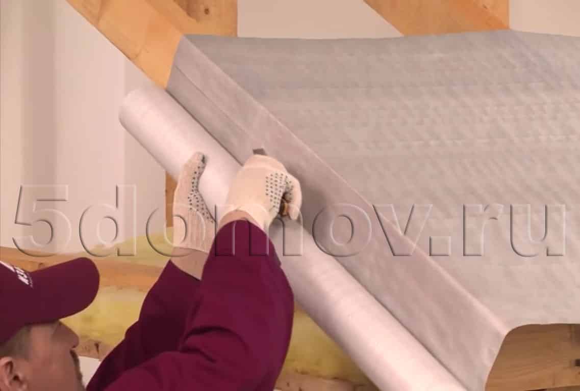 Для обустройства мансарды лучше всего применять мембранную плёнку. На утеплитель она ложится гладкой стороной. Чтобы влага не проникала через монтажные отверстия она крепится к балкам степлером. Материал с фольгой монтируется аналогичным образом, как и в предыдущих случаях. Крепиться может гвоздями с широкой шляпкой, стыки дополнительно герметизируются строительным скотчем. При утеплении стен с наружной стороны специалисты рекомендуют применять двойной слой пароизоляции.