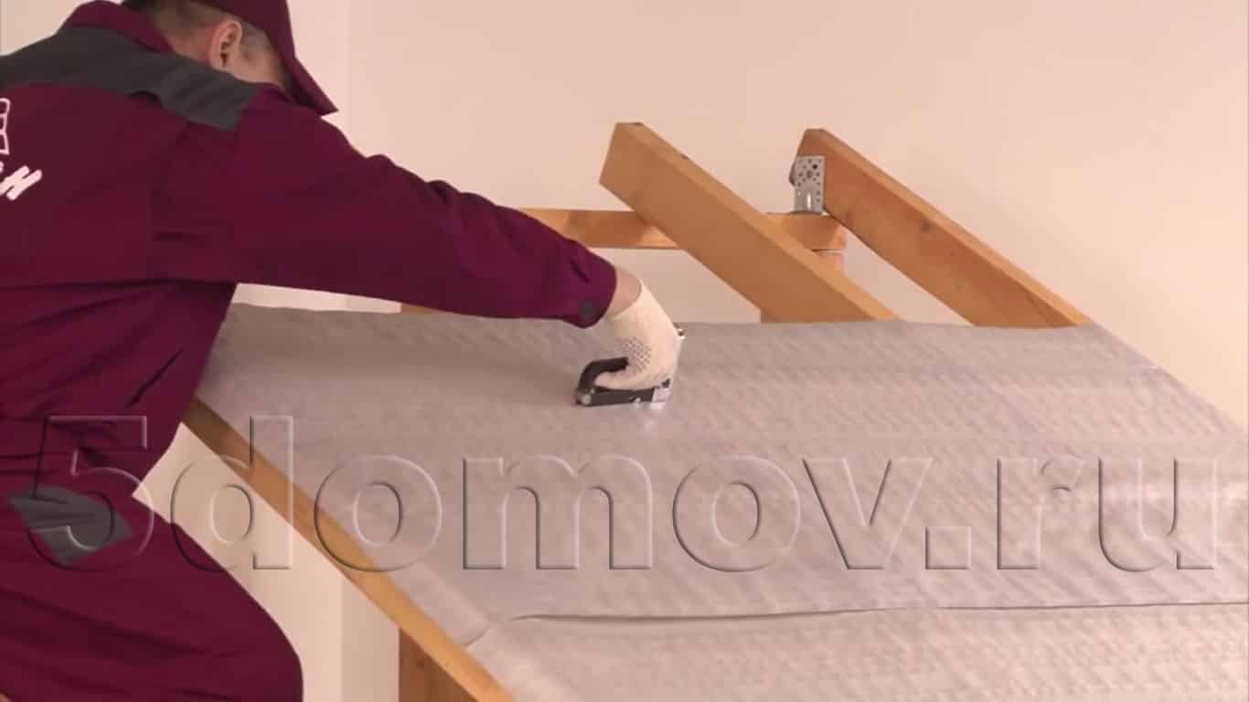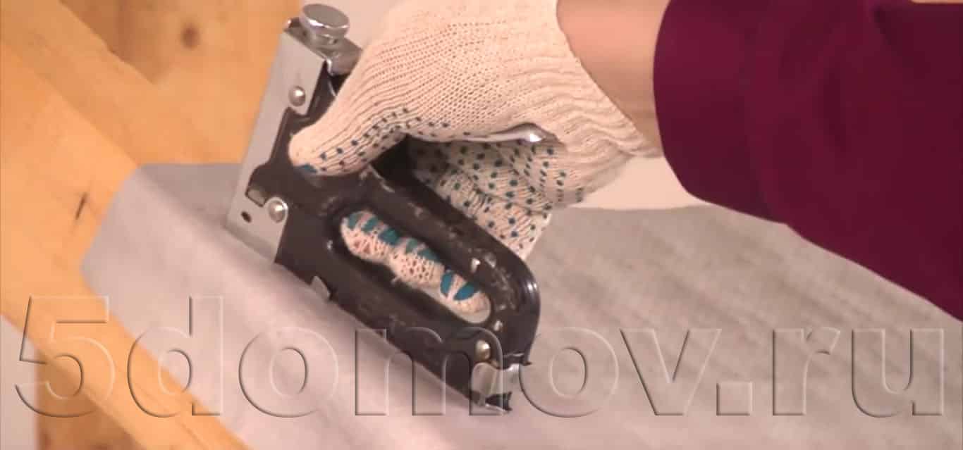 Шаг 2. Полотнища крепятся прямо к стропилам при помощи строительного степлера или гвоздей.