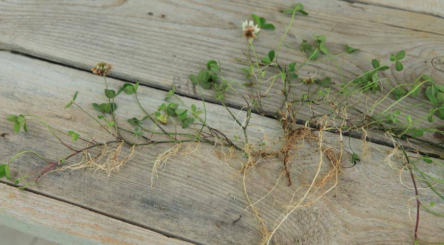 Виды корневищных сорняков: пырей ползучий, повой заборный, сныть, тысячелистник, клевер ползучий.
