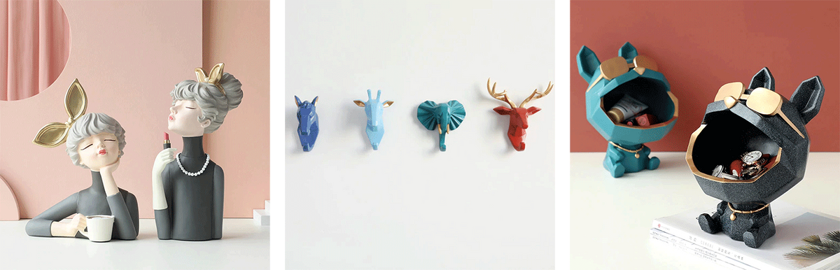 Магазин специализируется на декоративных статуэтках из смолы. Большая часть из них — не просто украшения, а полезные предметы интерьера: ключницы, крючки, держатели для бумажных полотенец и туалетной бумаги или пепельницы.