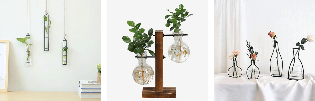 LDASQDD — находка для тех, кто любит растения, но не хочет нагружать интерьер тяжелой керамикой и увесистыми букетами. В магазине большой выбор минималистичных ваз на один цветок: просто стеклянные колбы в деревянных подставках или в тонком металлическом обрамлении.