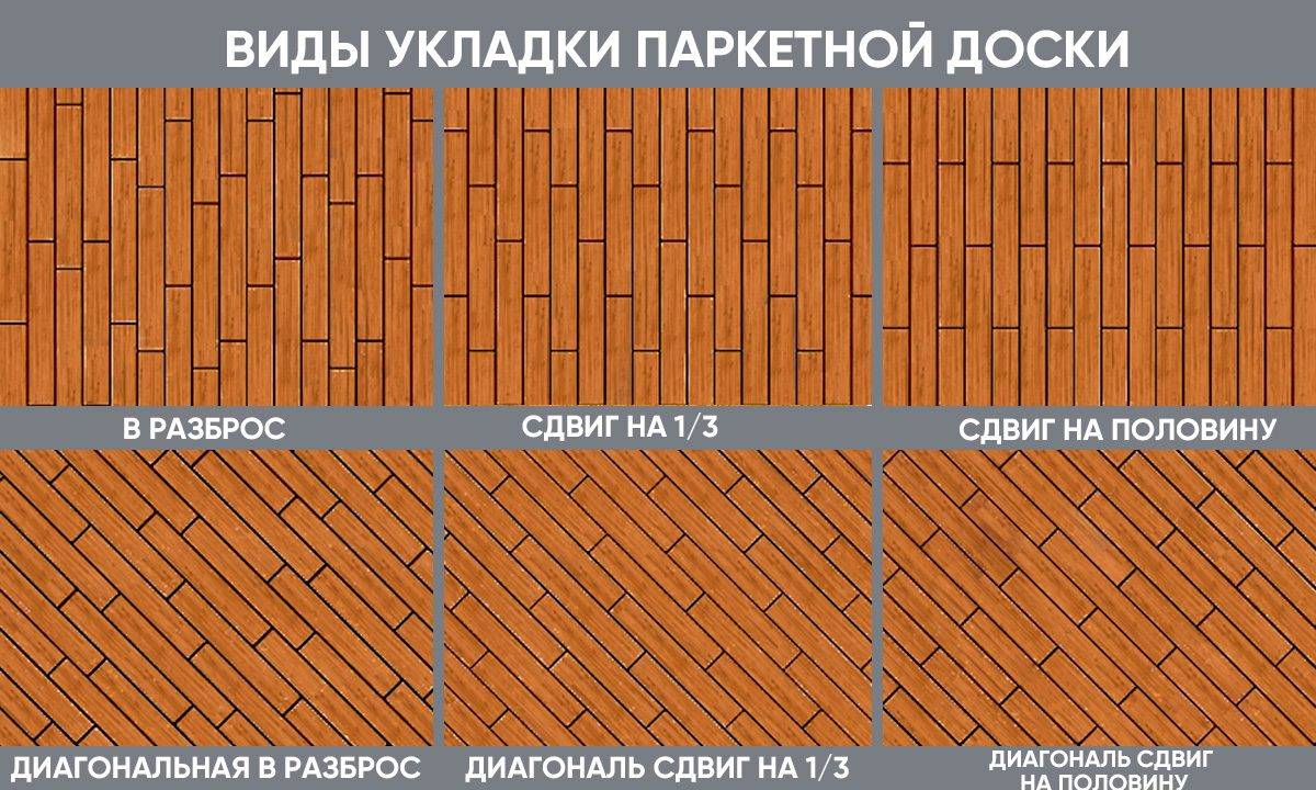 Самым распространенным типом паркета являются традиционный штучный, щитовой, а также паркетная доска. В зависимости от вида материала и типа основания, выбирается оптимальный вариант укладки. Можно выделить три основных.