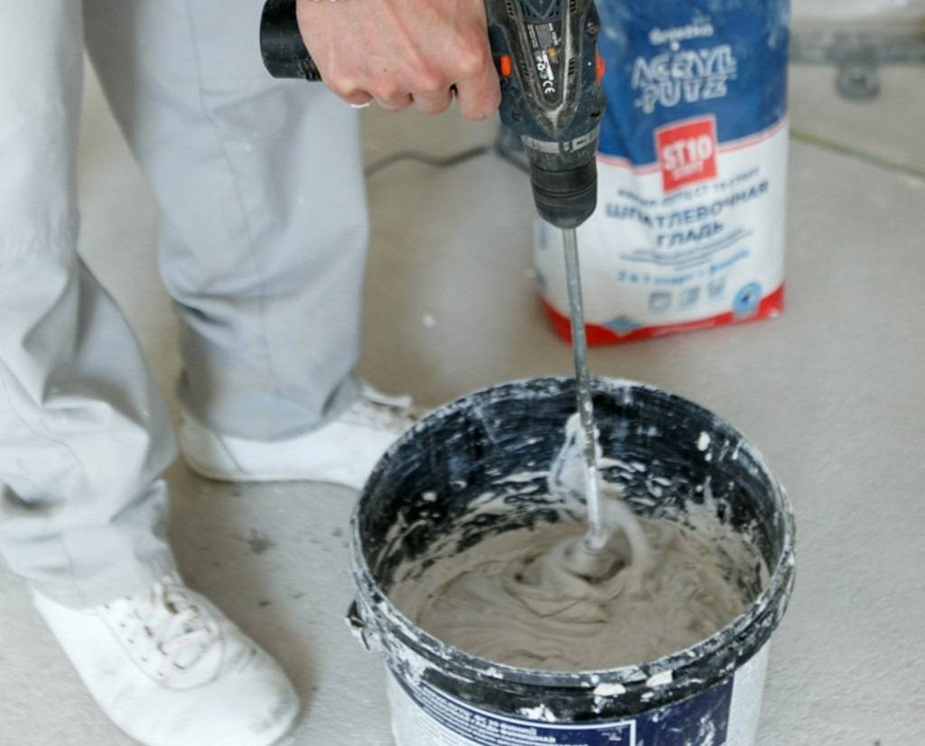 Шаг 2. В ведре при помощи дрели или перфоратора с насадкой-миксером замешивается раствор шпаклевки.