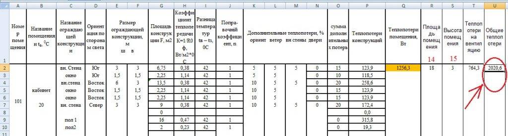 Как видно, потери помещения возросли. Если у вас заходит в помещение уже теплый воздух, этот шаг последний. Число записанное в столбце Q, и есть ваши искомые тепловые потери помещения. И эту процедуру нужно провести для всех остальных помещений.