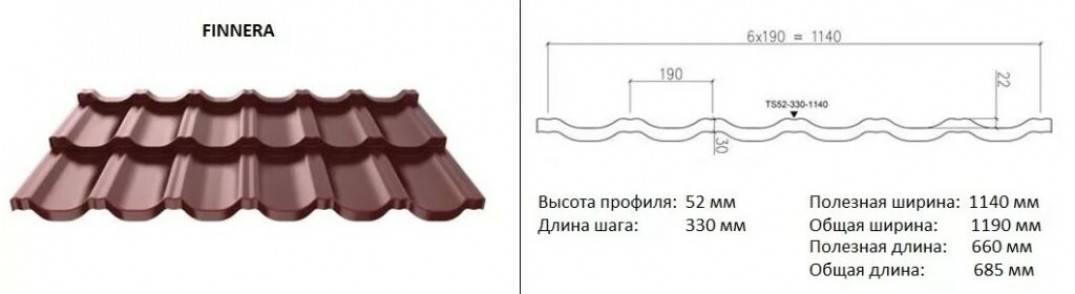 Финнера. Модульный кровельный материал размером 705х1190 мм финского производства. Двухволновой элемент снабжен загибом на передней кромке для дополнительной защиты крыши от непогоды.
