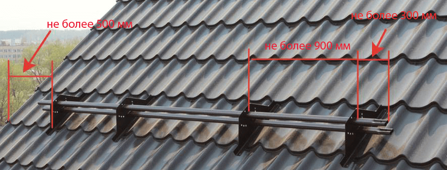 - в отверстия кронштейнов продевается труба снегозадержания. Максимальный вынос свободного конца от крайнего кронштейна не должен превышать 300 мм;
