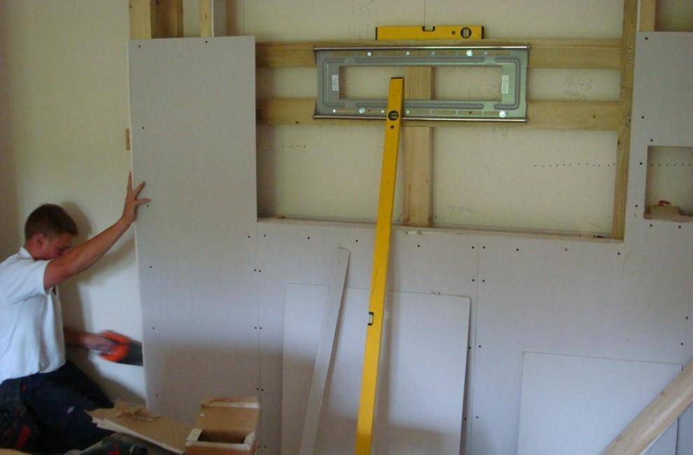 Если надо повесить телевизор на гипсокартонную стену, за которой нет базы, лучше отыскать места, где располагается монтажный профиль, и крепиться к нему. Можно также добавить к конструкции деревянную (древесно-волокнистую) плиту или аналогичный материал (доску, брус и так далее). Особенно хорош этот вариант для установки телевизора в нишу.
