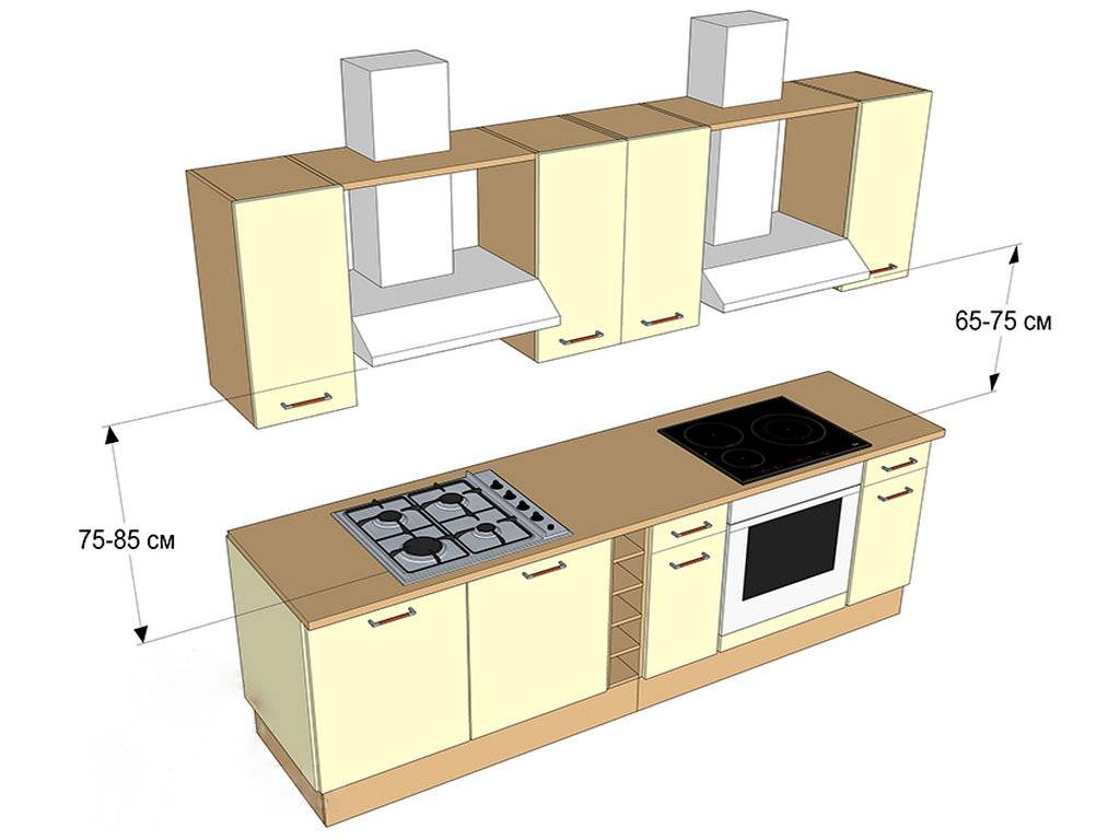 С высотой шкафа всё ещё менее однозначно. В общем случае расстояние между столешницей и дном верхнего яруса составляет от 50 до 65 см, в то время как рекомендуемое расстояние между вытяжкой и плитой составляет 75–80 см для газовых и 60–65 см для электрических варочных панелей. Получается, что секция с вытяжкой обычно выпадает из общего ряда, высота шкафа может быть на 80–120 мм меньше, чем остальных.