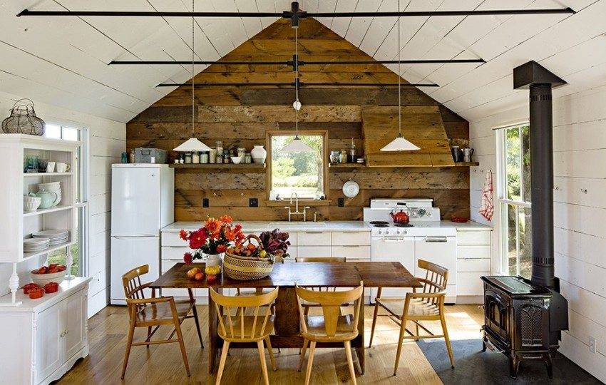 Каркасный дом-кухня оформлен с применением деревянных отделочных материалов