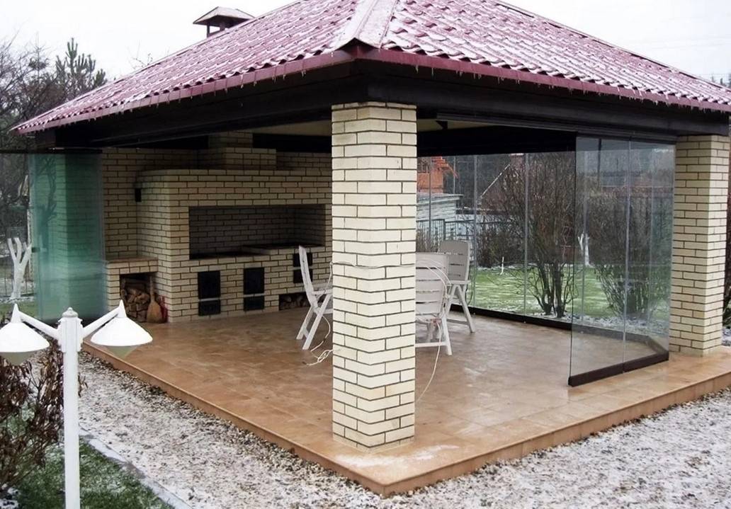 - с мангалом или без него – материалы для строительства должны быть пожаробезопасными в случае установки печного оборудования, а материал пола должен выдержать его вес;