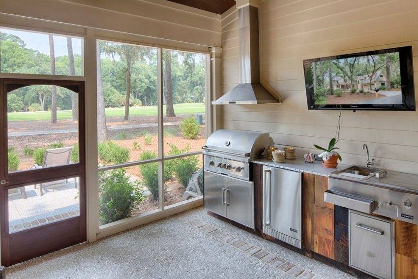 Если решено застеклить летнюю кухню, то вы можете это сделать полностью или же оставить часть проемов пустыми, создавая, таким образом, открытую веранду. Если вы предполагаете использовать вашу летнюю кухню исключительно для приготовления пищи, рекомендуется сделать помещение полуоткрытым, с двумя или тремя несущими стенами.