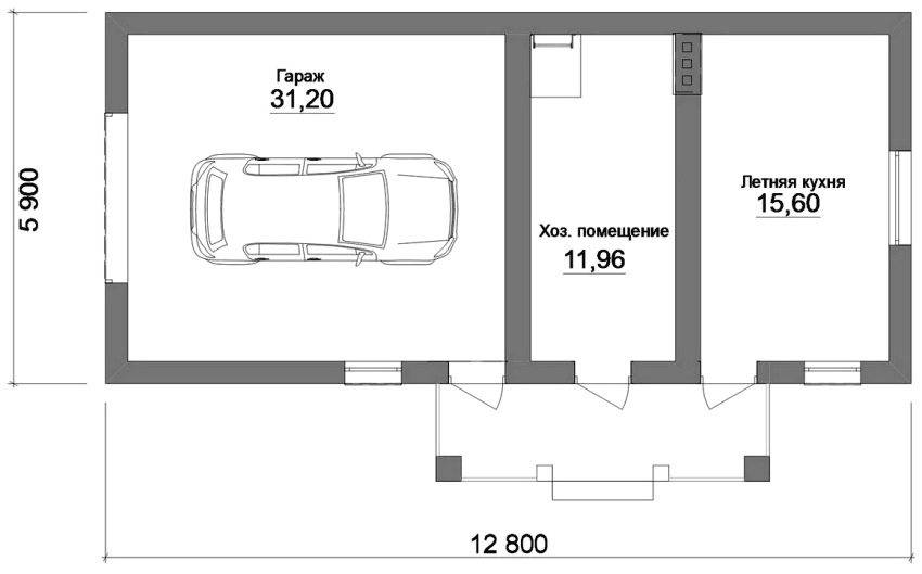 Проект дачной постройки с обустройством гаража, хозяйственного помещения и летней кухни