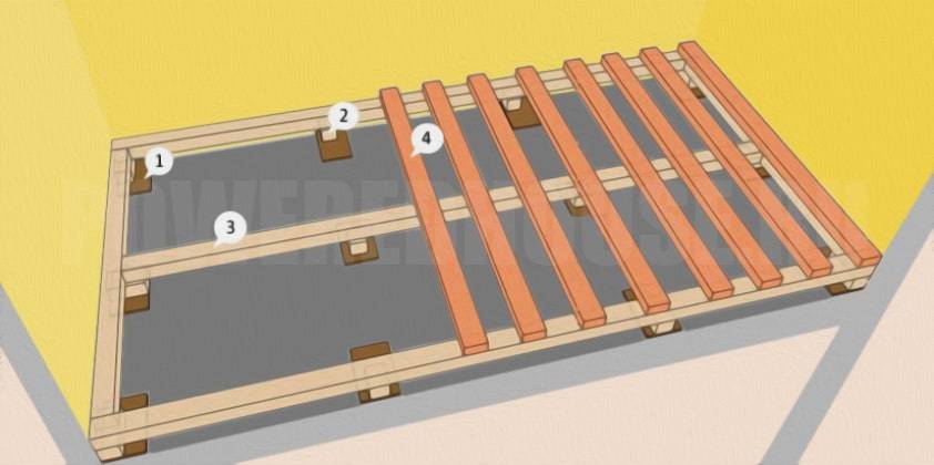 | 3 — лаги. Шаг их установки зависит от толщины и типа полового покрытия. | |