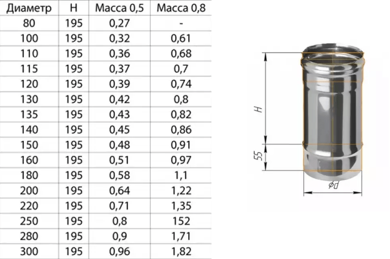 Диаметры стальных дымоходов: от 80 до 300 м.