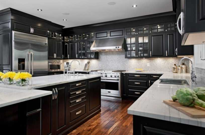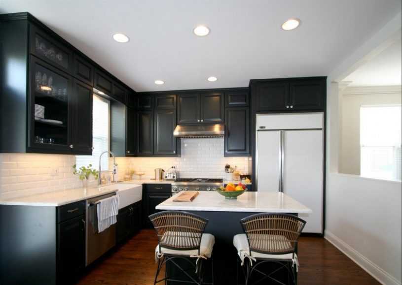Если у гарнитура черные фасады, то не стоит делать модную систему клик-кляк, лучше остановиться на обычных ручках и петлях, и тогда не придется так часто мыть фасады от отпечатков пальцев.