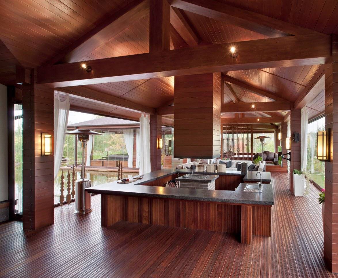 Фото 2. Терраса, выполненная в традиционном стиле. Основания постройки сделаны из красного дерева, печь барбекю из кирпича.