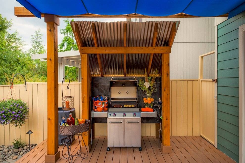 (4) Материал для крыши и ее конструкцию можно выбрать по своему усмотрению. Для открытых кухонь будет достаточно шифера или мягкой кровли.