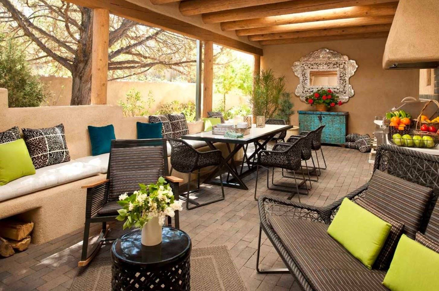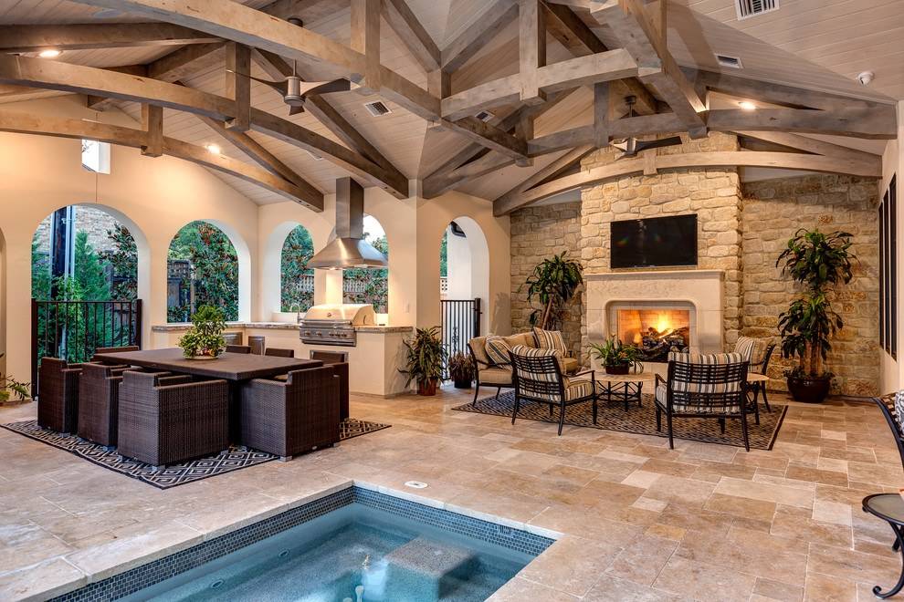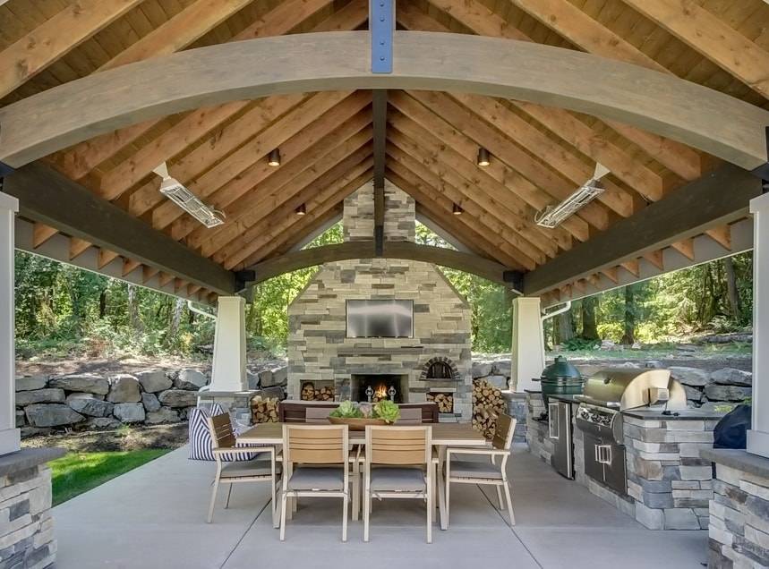 Фото 4. Открытая веранда, пристроенная к дому, с печью барбекю и обеденной зоной.