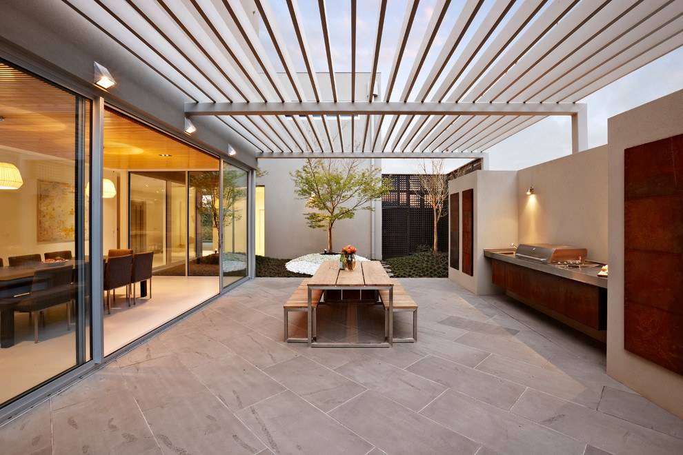 Фото 1. Терраса, пристроенная к дому, выполненная в современном стиле. Разделена на несколько зон.