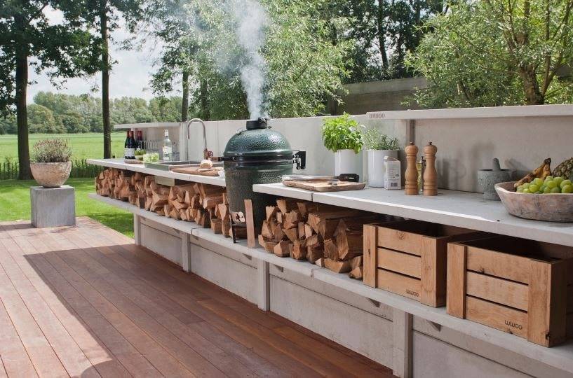 Открытые кухни строятся гораздо быстрее, так как не требуют разработки сложных чертежей. Одна часть площадки отводится для установки кухонного оборудования, а остальная – под место для отдыха. Их декорирование осуществляется текстилем, деревом, камнем, металлом, вьючными растениями.
