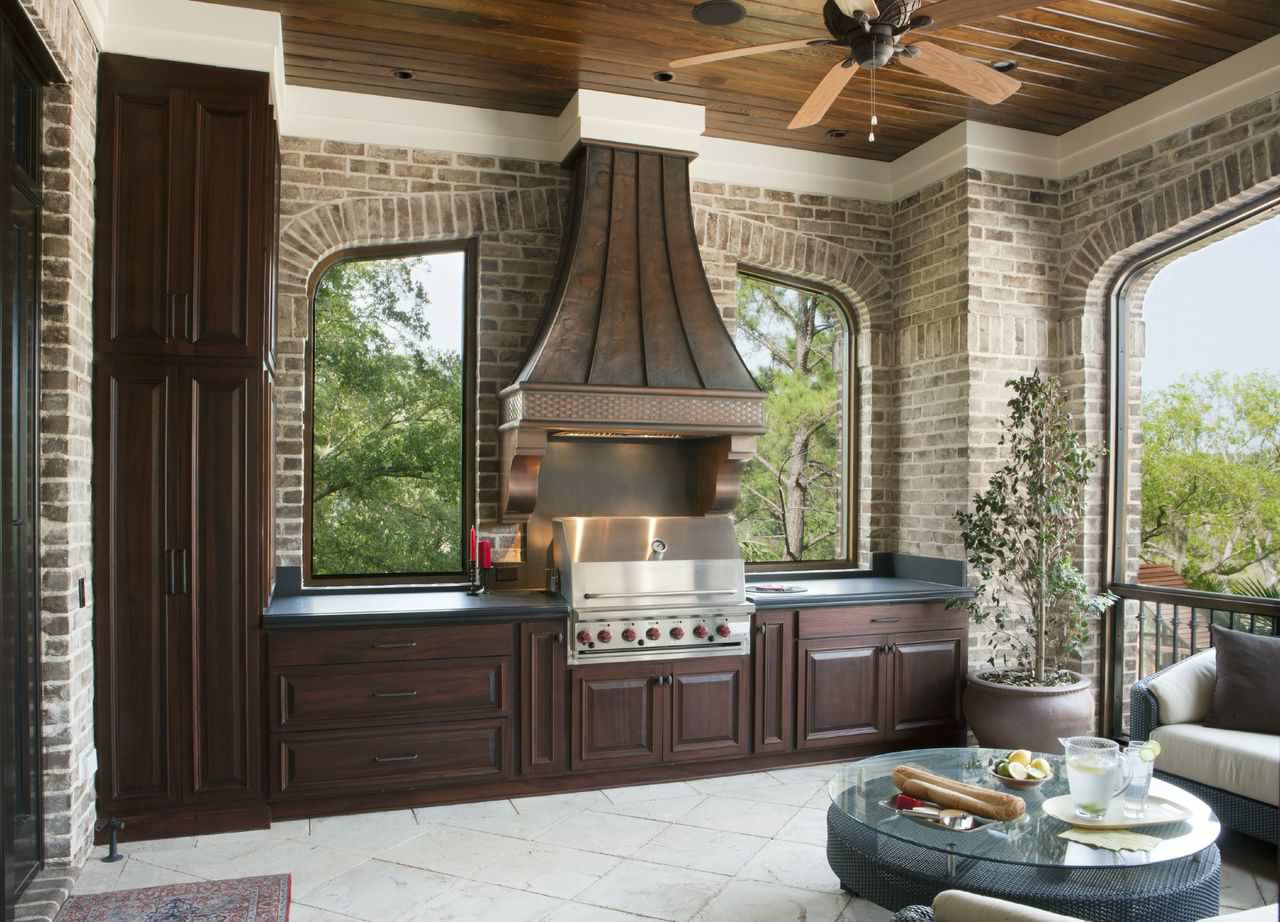 Закрытые летние кухни оснащены четырьмя стенами, окнами, полом и крышей. От обычного дома они отличаются лишь меньшей толщиной стен и возможностью возведения облегченного фундамента. Обычно их делают из кирпича, бруса или бревен.