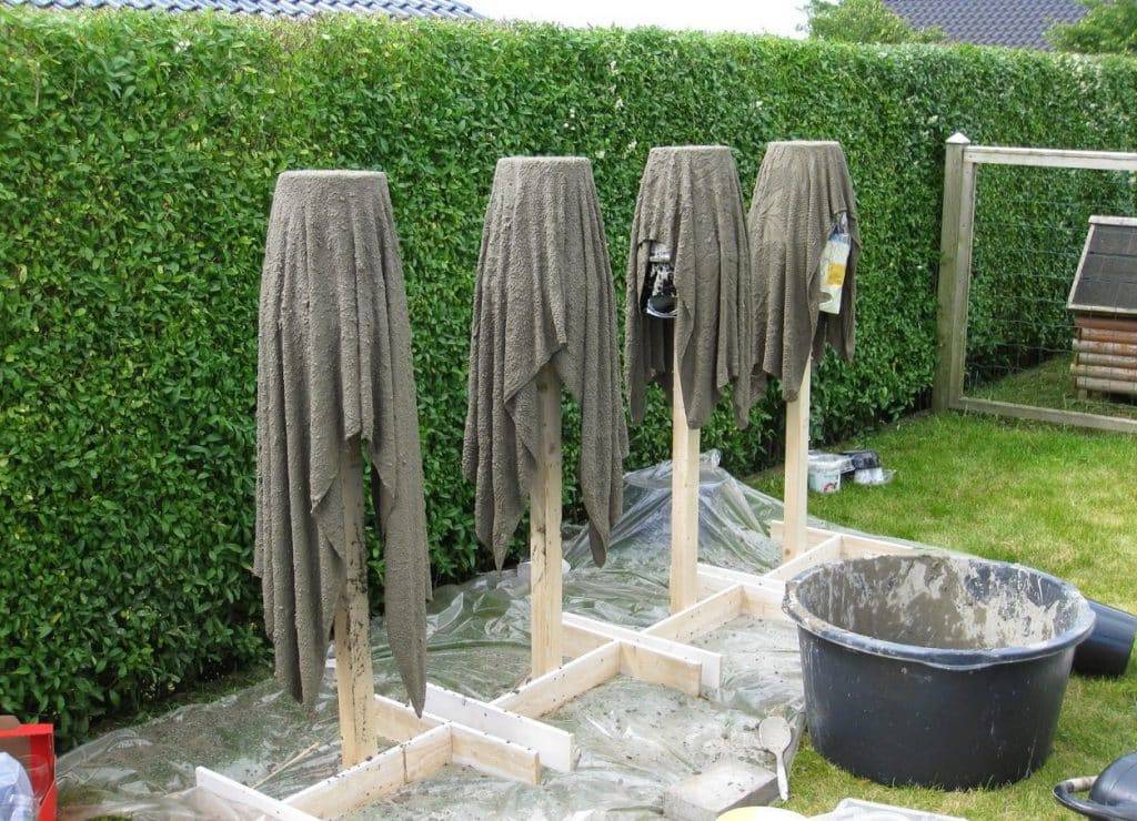 - Укладка текстиля сверху на форму так, чтобы края ткани равномерно свисали по бокам, формирование аккуратных складок, подвязка шнурами или веревками до схватывания раствора