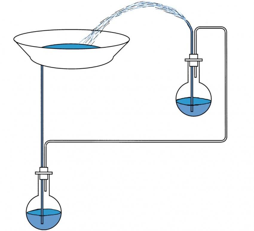 - вода из верхней чаши попадает в нижнюю бутылку, выталкивая воздух во вторую емкость;