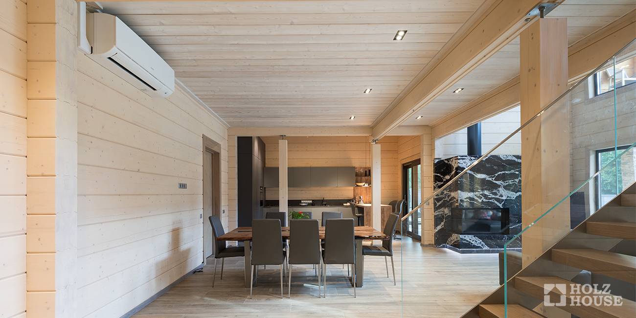 - воздушная климатическая система – это воздушное отопление, которое может работать круглый год. Технически это выглядит так – к воздухонагревателю подключены воздуховоды, по которым чистый воздух проникает в дом, а отработанный отводится. Все это надежно спрятано от человеческого глаза и не портит интерьер. Визуально воздушное отопление выглядит как вентиляционные решетки, расположенные на полу, стенах или на потолке. Радиаторы, ниши для них, стояки, характерные для привычной нам системы отопления, отсутствуют. Управление очень удобное, оно осуществляется с помощью пультов ДУ.